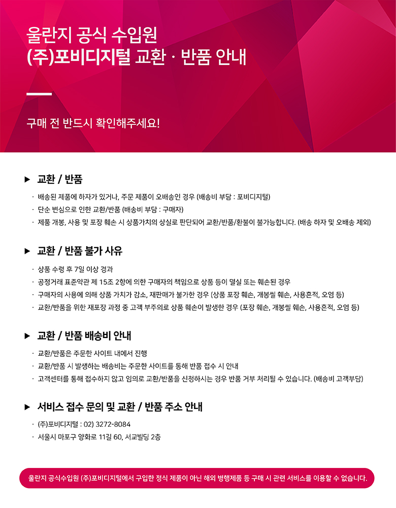 제품이 초기 불량 또는 오배송인 경우, 포비디지털 고객센터로 전화해 주셔서 안내받으신 뒤 하단 교환/반품 처리 과정을 따라주시기를 바라며, 로젠택배가 아닐 경우에 수취거부 또는 배송비용이 발생할 수 있습니다.