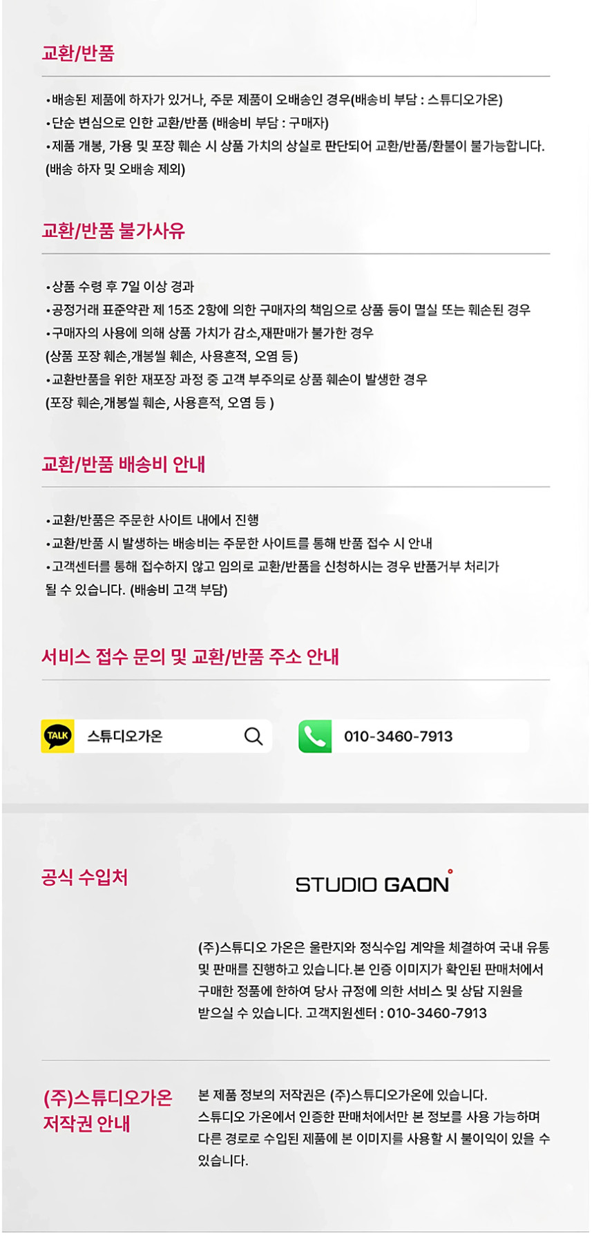 - 상품 설명에 별도의 교환/반품이 고지된 상품은 해당 상품 내용에 따라 처리되오니, 이 점 꼭 확인하시기 바랍니다.