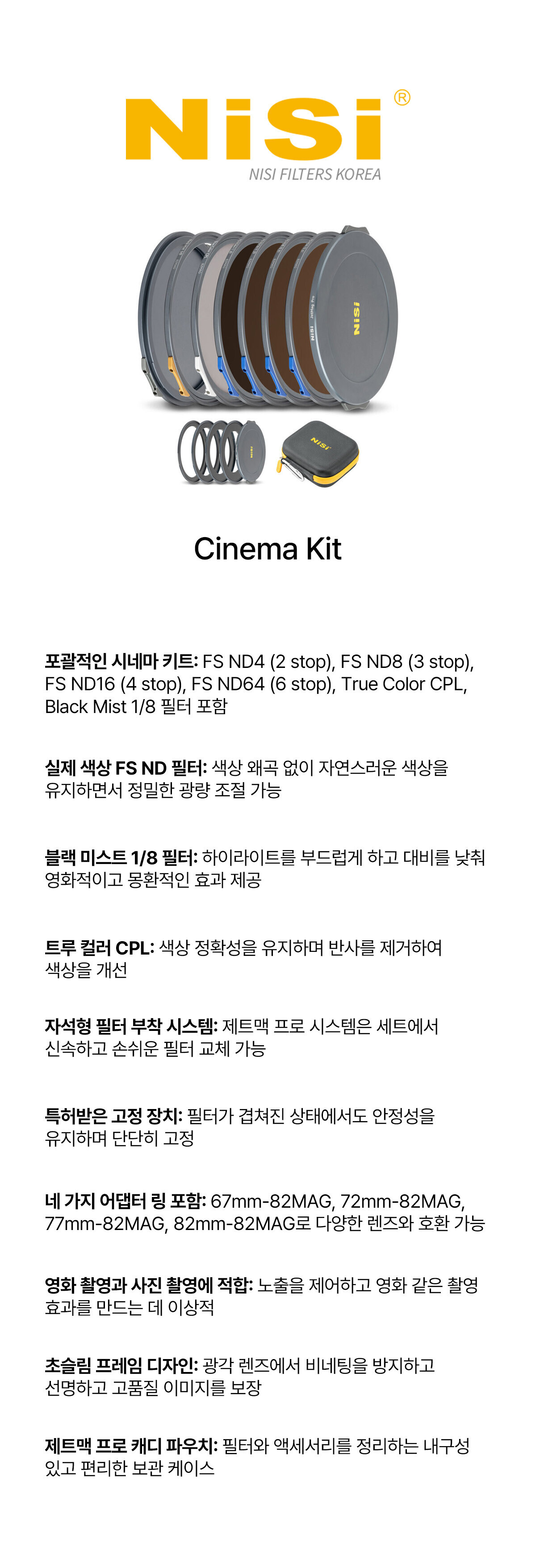 [NiSi Filters] 제트맥프로 시네마 킷 82MAG Cinema Kit - JetMag Pro 82MAG - ND4+ND8+ND16+ND64 +TC CPL+BLACK MIST 1/8 67/72/77/82mm ring 2pcs, front cap 1pcs, back cap 1pcs, filter bag