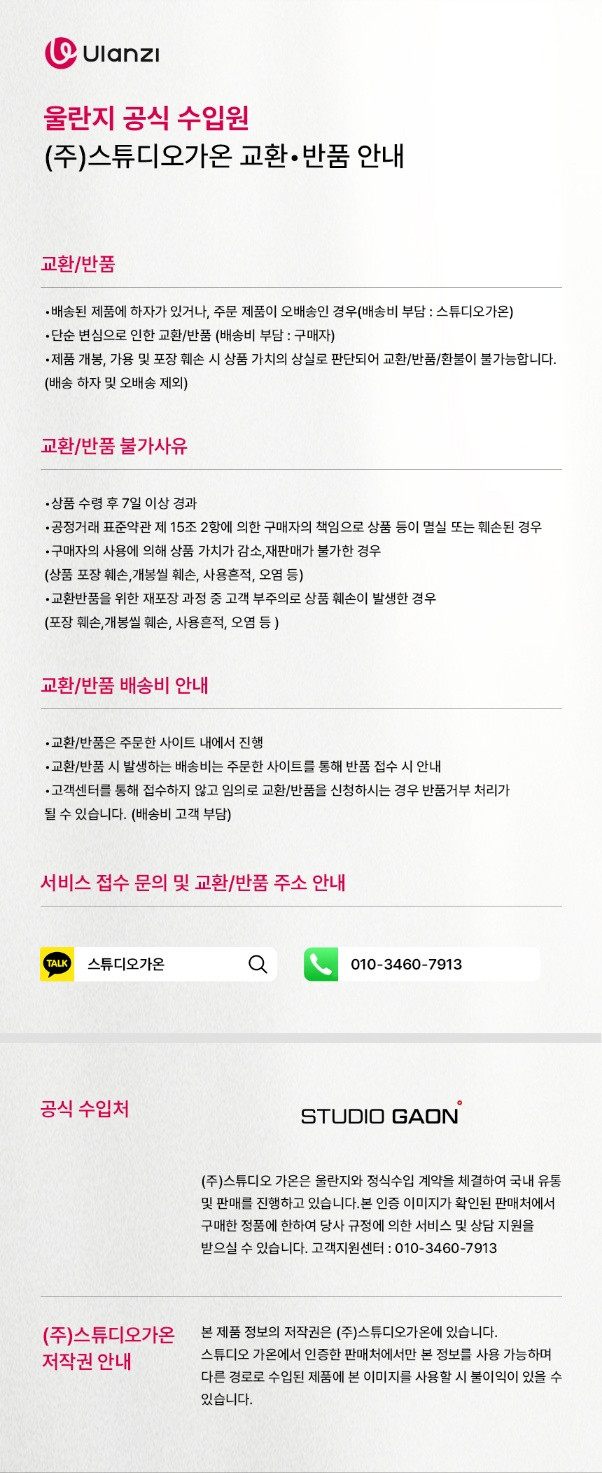 - 상품 설명에 별도의 교환/반품이 고지된 상품은 해당 상품 내용에 따라 처리되오니, 이 점 꼭 확인하시기 바랍니다.