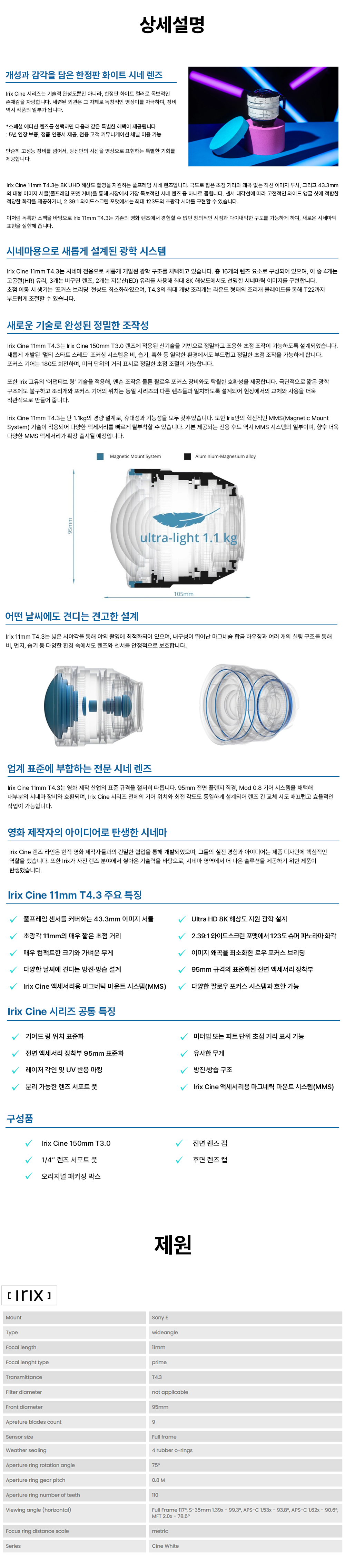 아이릭스 Irix Cine Lens 11mm T4.3 White ( Sony E / Canon RF / Canon EF / PL-mount )