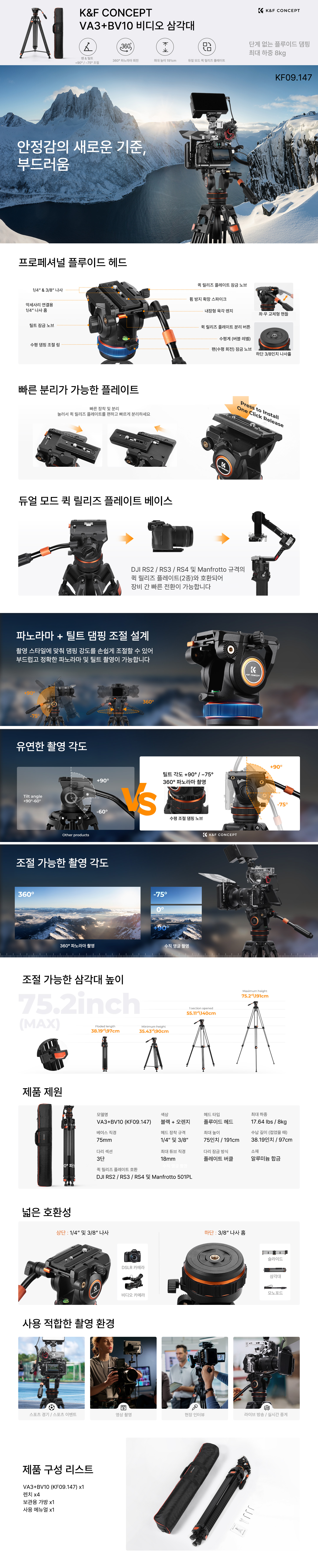 K&F CONCEPT 3단 유압식 알루미늄 비디오 삼각대 KF09.147