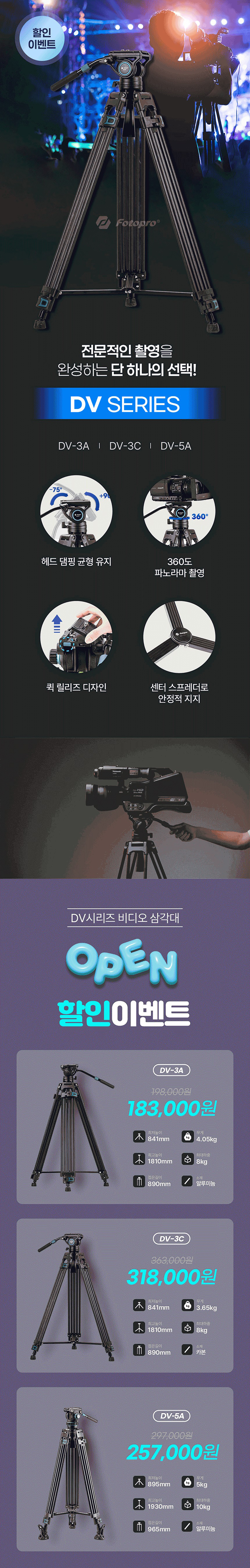 [Fotopro] 포토프로 DV-3A 카메라 비디오 삼각대 최대 하중 8kg
